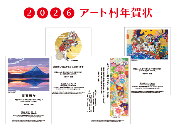 なかなか会うことのできないご友人やご挨拶、お世話になったあの方へ。 年始のご挨拶にアート村のアート作品が入った年賀状を送りませんか? 12種類の絵柄からお好きなものをお選びいただけます。
