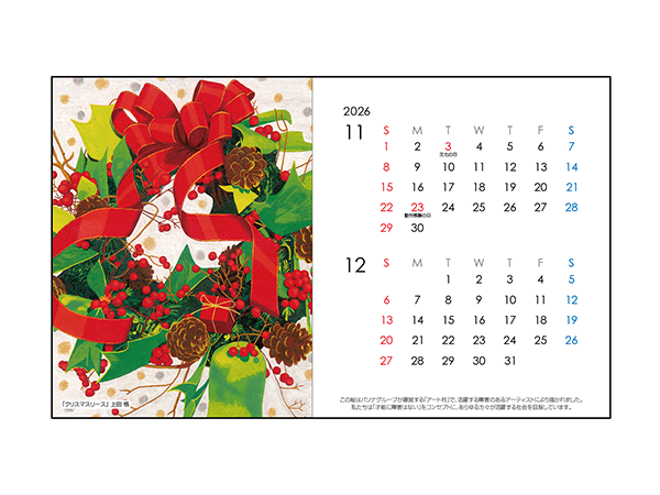 アート村カレンダーには、ご自身やご家族、ご友人の名入れや、企業・団体・サークル名またはお好きな言葉等の名入れが可能です。世界でひとつだけのオリジナルカレンダーを、大切な方へのプレゼントや、企業のノベルティグッズとして、ぜひご利用ください。