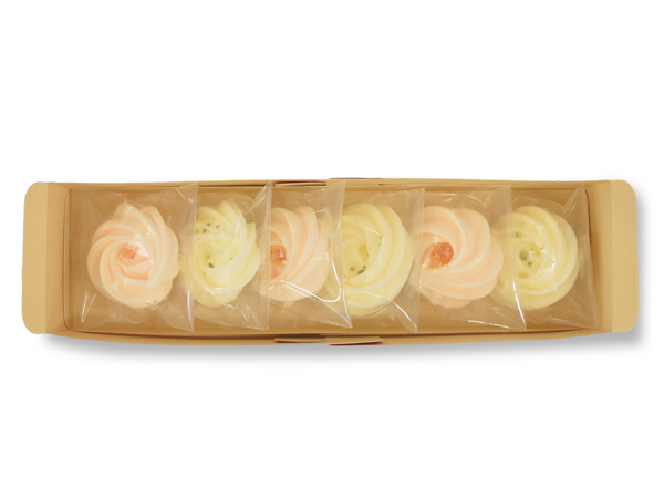 【内容】メレンゲピスタチオ×3個、メレンゲオレンジ×3個【BOXサイズ】縦7cm×横26cm×高さ5cm